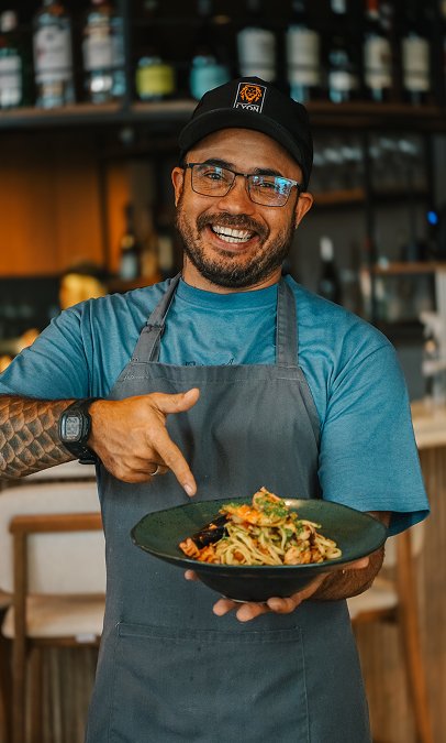 No piso térreo, comandado por Hélio Marques – premiado dono do restaurante Lyon – nosso restaurante homenageia essas influências com respeito e criatividade: pratos nascidos de tradições globais, reinterpretados com ingredientes, sotaques e afetos brasileiros.